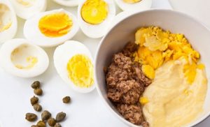 اسلقي البيض في قشرة شديدة الانحدار ومقطعة إلى قطعتين متساويتين نصفي وإزالة صفار البيض. إرسال صفار البيض إلى وعاء. الأغذية المعلبة تفتح من التونة ، تعجن مع شوكة ، وضعت في صفار ، أضف المايونيز وعصير الليمون والملح وطحنه بخلاط.