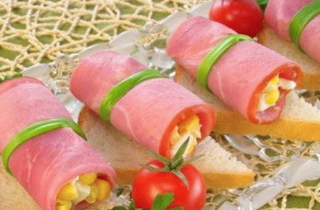 لفائف لحم الخنزير اللذيذ واللذيذ ، طهي في المنزل مع سلطة. يمكنك استخدام أي سلطة ، في هذه الحالة – سلطة البيض والذرة وعصي السلطعون (البصل المفروم للسلطة ، البيض المسلوق والعصي السلطعون ، مع الجمع بين الذرة دون السوائل ، مملحة قليلاً ومتبلة بالمايونيز). لمدة ست وجبات تحتاج ستة ملاعق كبيرة من السلطة.