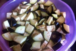 - نقطع الباذنجان إلى شرائح متوسطة الحجم.