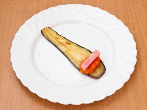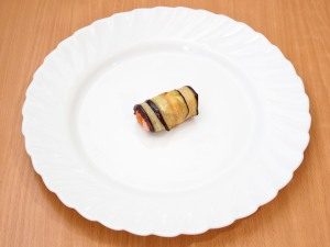 - ضعي الحشوة على الباذنجان النهائي ، ضع شريحة في الأعلى لحم خنزير ، لف في لفة.