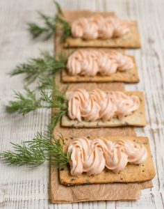 فكرة رائعة لتناول وجبة خفيفة لذيذة على الطاولة الاحتفالية. يُطهى الكريما محلية الصنع من السلمون المدخن وجبنة الكريمة ويُقدم على المفرقعات متموج.