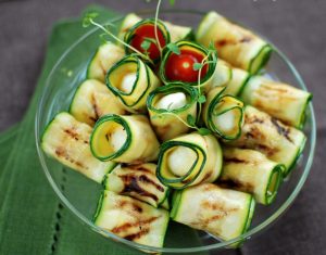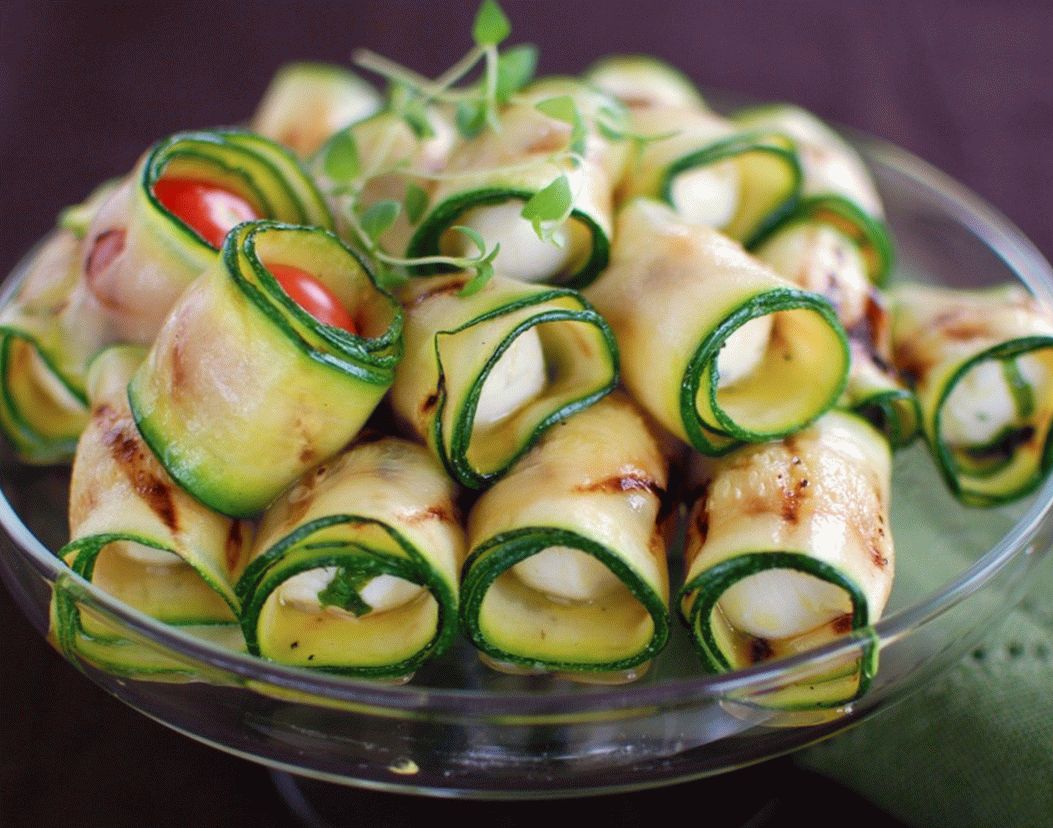 على شرائح الكوسة المُعدّة ، انشر كرات الموزاريلا ، تتحول إلى الروليت ، وإرسالها إلى لوحة وتقديمها على الفور الجدول.