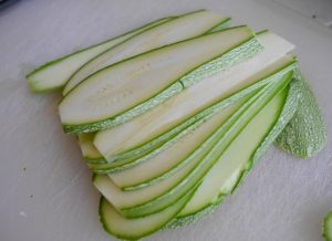 كوسة مقطعة إلى شرائح رقيقة ، مع رش الملح ، ويرش النفط وشحنها على دفعات إلى عموم شواء. يقلى مع 2 الجانبين ليونة وإرسالها إلى لوحة.
