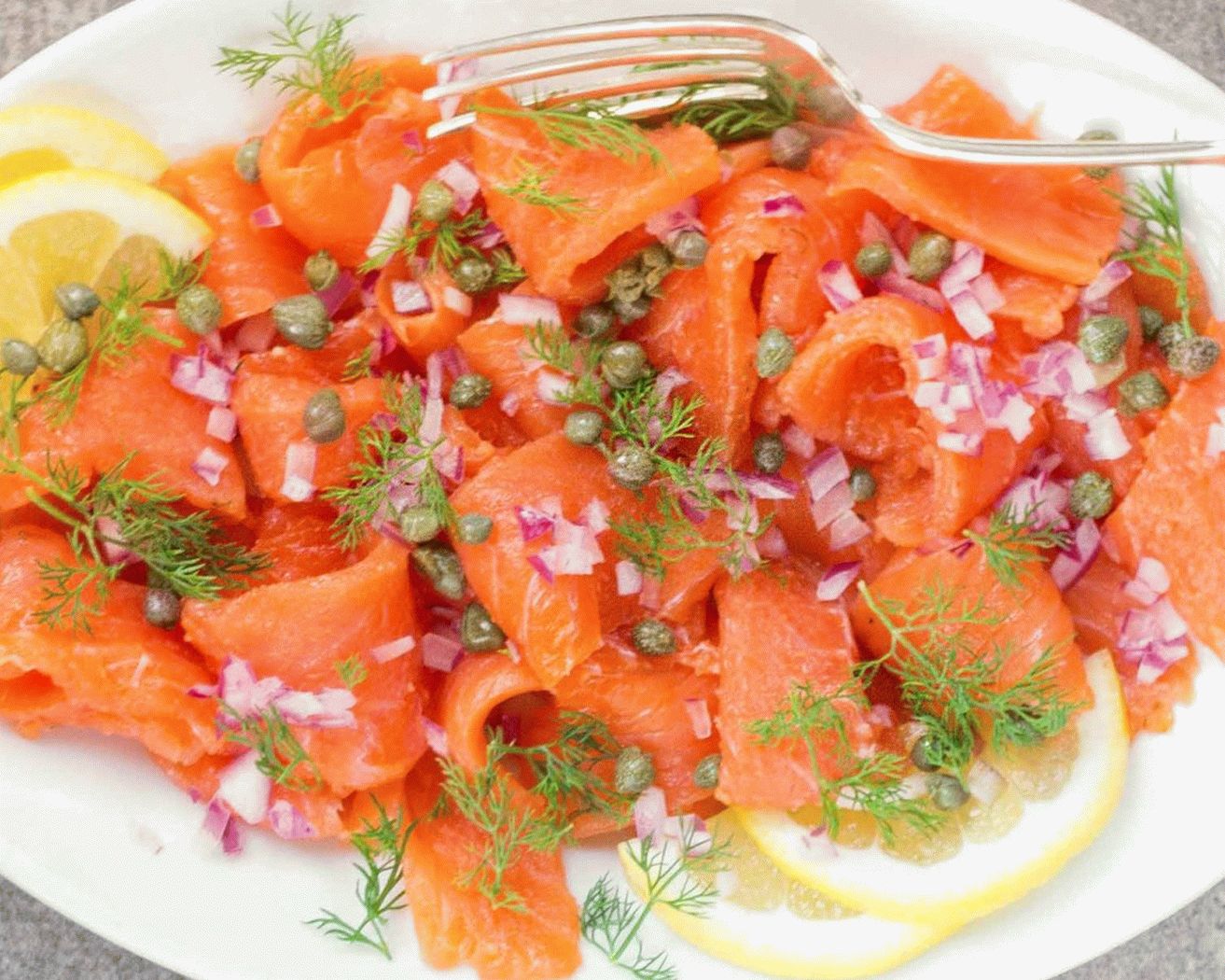 غسل القطع العطرة من سمك السلمون المملح وجافة و مقطعة إلى شرائح. يمكن تقديم سمك السلمون المملح محلي الصنع شطائر أو بالزبدة مع الكبر والبصل الأحمر المفروم ، شبت وشرائح الليمون.