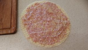 - توضع على الكعكة طبقة من اللحم المفروم.