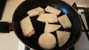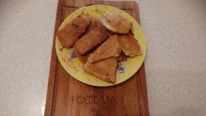 - في مقلاة ، تسخين الزيت النباتي ويقلى لدينا شرحات حتى البني الذهبي على كلا الجانبين.