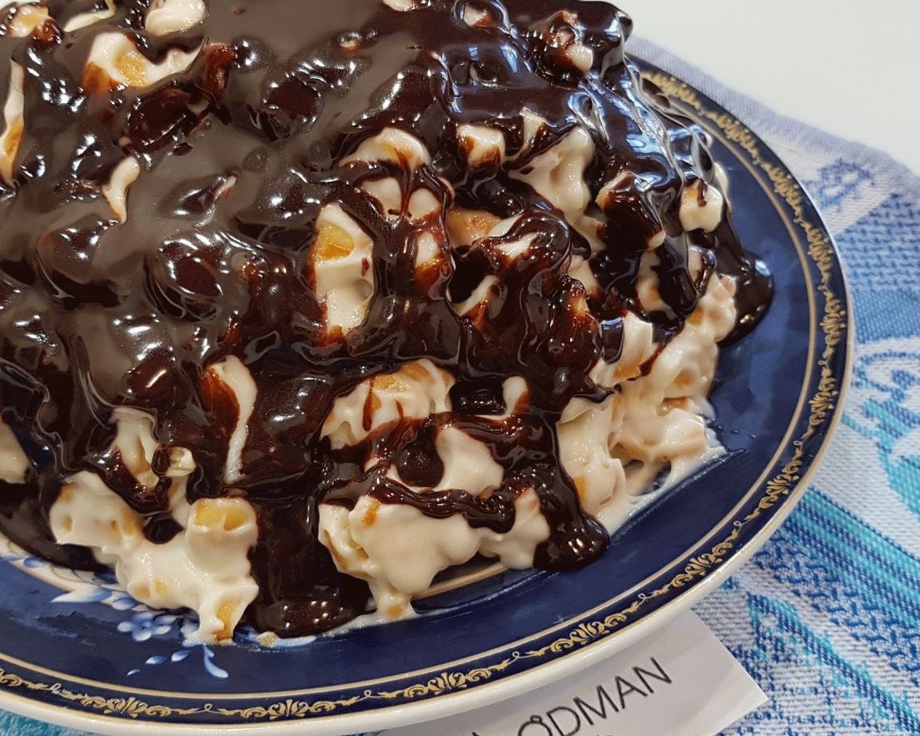 - تُسكب الكعكة في الأعلى مع تجمد الشوكولاتة المبردة قليلاً.
