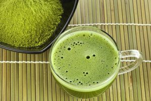 الشاي الأخضر الياباني في شكل مسحوق سكران مع ا مع أوراق الشاي. حتى في الجسم والحصول على المواد المفيدة. ال التانين خاصة مع مضادات الأكسدة ، المضادة للالتهابات و خاصية antitumor. المشروب الشاي ماتشا مع الحليب والأبيض الشوكولاته ، ويضمن فرحة الذوق!