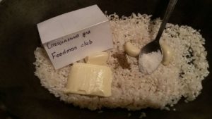- يُسكب الأرز في مقلاة ذات قاع سميك ، ويوضع الكمون والملح ، الزبدة.