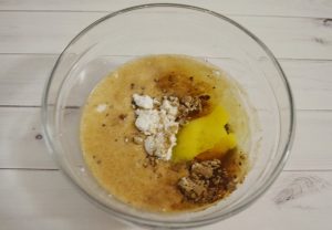 - يضاف زيت الزيتون والحليب والبيض. تخلط جيدا.