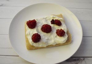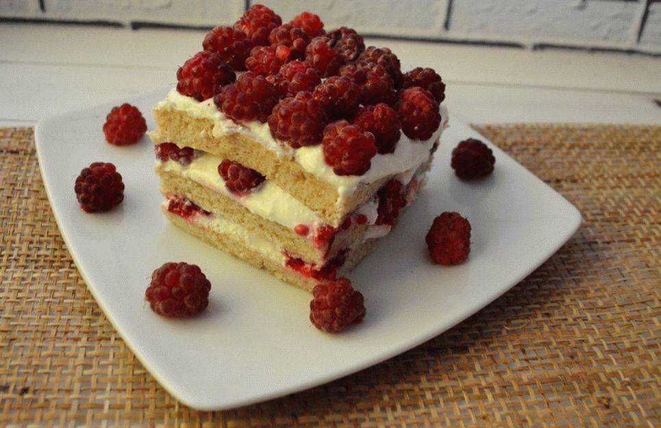 - قطع الكعكة إلى مستطيلات أو مربعات ، والشحوم كريم الناتجة وإضافة التوت. لذلك كرر ثلاثة مرات.